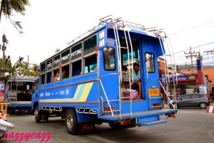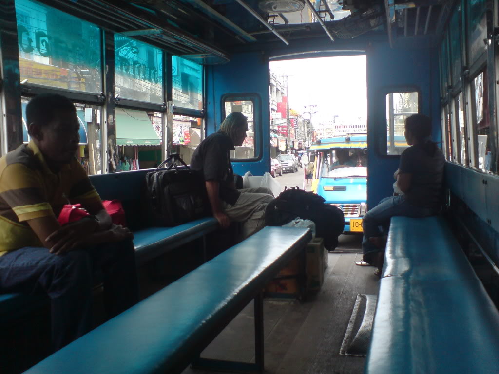 Setelah melalui Suriyadate Fountain, saya berjalan ke arah Ranong Road untuk mencari tempat parkir Songthaew menuju Patong Beach. Tempat parkirnya terletak tepat di depan Thai Airways Building. Songthaew itu sendiri seperti mini bus yang sudah dimodifikasi sedemikian rupa sehingga tempat duduknya berderet panjang menyamping dan saling berhadapan. Bentuknya kuno tapi bersih dan cukup dingin dengan angin jendela yang bertiup sepoi-sepoi. Bila ingin menjelajah kota Phuket dengan cara walking tour (tour favorit saya karena murah meriah dan melangsingkan) dapat berpedoman pada peta ini http://www.phuket-maps.com/treasure-map-xl.htm.