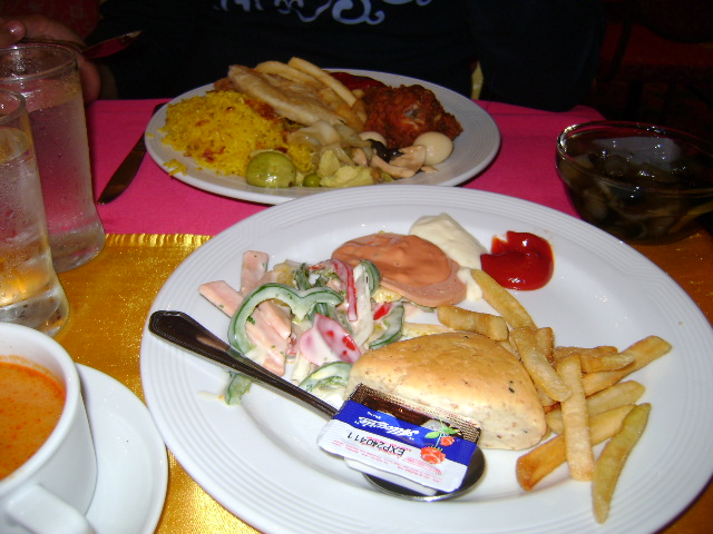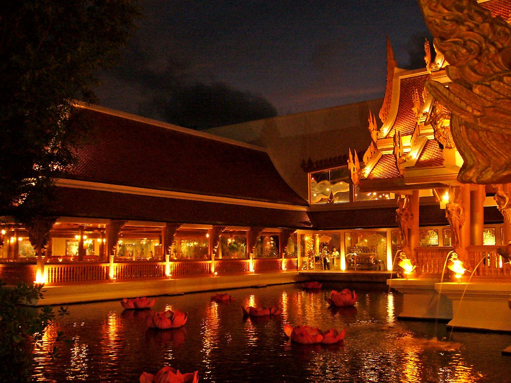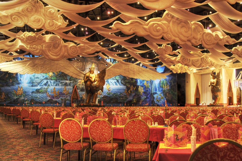 Setelah menukar kuitansi dengan tiket dan voucher makan, saya masuk ke area seluas 34  ha ini. Sebelum masuk ke ruang pertunjukkan, kami diberi makan dulu. Makan malam yang disajikan sangat berlimpah, bervariasi (tersedia menu dari berbagai negara) dan rasanya enak. Saya di dudukkan semeja dengan orang Indonesia lain di bagian makanan halal. Itulah sebabnya pada saat menukar tiket saya ditanya asal negara. Saat itu kami berkenalan dengan sepasang suami istri dan satu keluarga yang kesemuanya dari Jakarta. Restorannya sendiri sangat megah, dengan dekorasi emas ala Thailand. Menurut data restoran ini mampu menampung 4000 orang.
