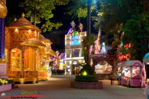 Selesai makan malam, saya berjalan-jalan di sekitar area pertunjukkan yang penuh dengan toko-toko dan atraksi permainan (persis seperti pasar malam modern). Toko-tokonya didesain sedemikian rupa sehingga terlihat unik dan menggambarkan tokoh-tokoh dalam pertunjukkan Phuket Fantasea. Kamera saya, tidak bisa menggambarkan suasana dalam area ini dengan baik, untuk itu saya ambilkan foto dari Phuket Report.com (thank’s).