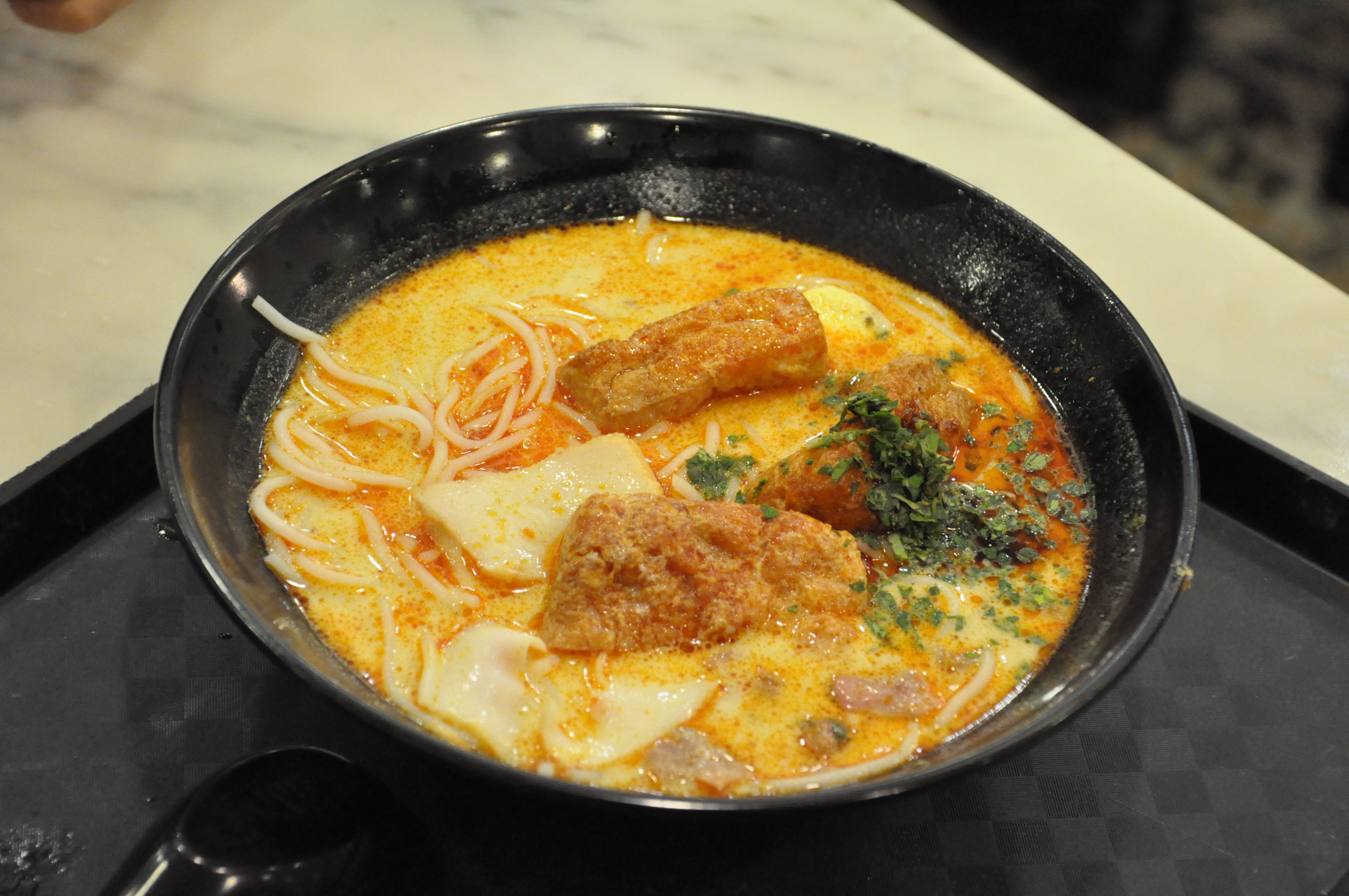 Salah satu makanan khas Singapura yang saya coba di sini adalah Laksa. Laksa adalah mie (bisa juga bihun) dengan kuah kari yang pedas. Makanan ini mengandung santan, telur dan udang. Laksa di Singapura ada banyak macamnya, ada yang pakai mie ada yang pakai bihun. Bahan lainnya adalah tahu goreng (taupok), telor rebus, terkadang ada kerang dan dicampur juga dengan tauge.