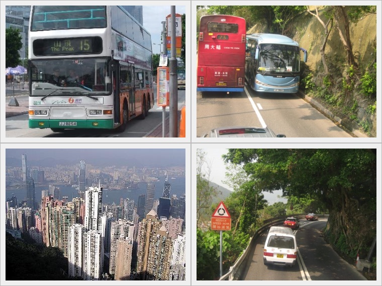 Dari daerah Causeway Bay, kami naik MTR ke stasiun Admiralty. Di stasiun ini keluar di exit C1, jalan kaki sedikit ke depan Admiralty Garden dan Queensway Plaza kemudian naik bis No. 15 menuju The Peak. Perjalanan dengan bis selama 30 menit ini menawarkan lebih banyak pemandangan indah daripada naik The Peak Tram. Melewati Stubbs Road yang berkelok-kelok mengingatkan saya akan kelokan jalan Batu – Pujon, sempitnya sama cuman jalan yang ini lebih tahan longsor karena salah satu sisinya sudah di tembok. Untuk pemandangan yang maksimal, naik saja di tingkat atas (bisnya berbentuk Double Decker). Dari atas, kita akan melihat bagian belakang gedung-gedung di daerah Central, Wan Chai dan Causeway Bay dilatar belakangi pemandangan selat Victoria Harbour yang indah.