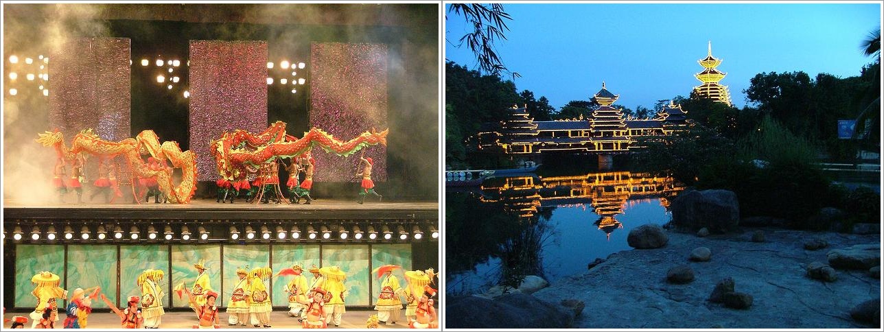 China Folk Cultural Garden, mungkin bisa disebut taman mini-nya Cina. Berisi 24 gambaran suku-suku di Cina lengkap dengan kebudayaan dan rumah adat mereka. Di tempat-tempat tersebut kita juga disuguhi beberapa tarian dan pertunjukkan gratis sesuai dengan daerahnya. Selain pertunjukkan kecil-kecil tersebut ada tiga pertunjukkan besar yang tidak gratis yaitu :