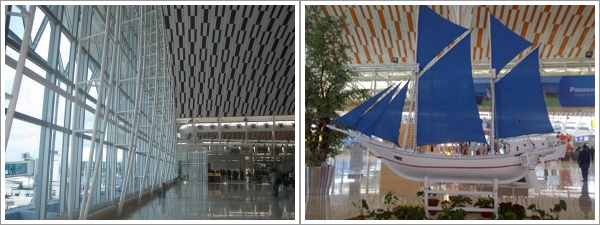 Penerbangan ke Makassar akan berangkat jam 06.30 pagi, jadi kami pesan travel jam 3 dari Malang untuk mengantar kami ke Juanda. Tidak ada hambatan yang berarti sampai mendarat di bandara Sultan Hasanuddin. Bandara ini walaupun tidak sebesar Juanda memiliki interior dalam yang cantik dengan ornamen-ornamen khas Makassar di setiap sudutnya. Desain eksteriornya bersifat minimalis dan eco-friendly yang bertujuan meminimalisir penggunaan energi listrik dan lebih mengandalkan cahaya matahari sebagai penerang ruangan dengan melapisi rangka bagian luarnya dengan kaca sehingga tampak lebih terang. Dari dalam plaza, calon penumpang bisa menikmati pemandangan hilir-mudik pesawat yang baru mendarat dan akan lepas landas.