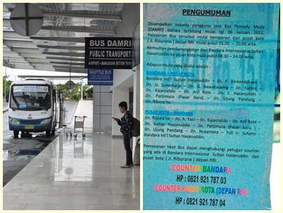 Begitu keluar dari bandara, kami menuju pemberhentian Shuttle Bus dan Bus Damri Bandara. Dari bandara Sultan Hasanuddin ada beberapa cara untuk menuju pusat kota Makassar. Selain sepeda motor ojek, mobil carter dan taxi ada moda transportasi yang lebih murah yaitu Shuttle Bus Bandara (hanya mengantar sampai gerbang utama bandara dan bayarnya gratis) serta Bus Damri Bandara (mengantar sampai pusat kota dengan tiket Rp. 15.000,-). Tapi terus terang, bagi yang punya janji pertemuan bisnis jangan menggunakan kedua moda transportasi diatas karena nunggunya lamaaaaaa sekali. Kalau yang Shuttle Bus lebih mending paling setiap 30 menit sekali pasti ada yang datang tapi Bus Damrinya, perlu waktu 1,5 jam menunggu kedatangannya (hampir sama dengan penerbangan Surabaya-Makassar). Sampai sempat terpikir, jangan-jangan Bus Damrinya nggak jalan :). Rute yang dilewati Bus Damri Bandara bisa dilihat di foto ini.