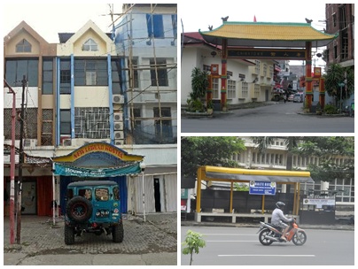 Bagian Depan Hostel New Legend (Kiri), Gerbang Jln. Jampea (Kanan Atas), Halte Bis Damri Bandara Jln. Riburanne (Kanan Bawah)