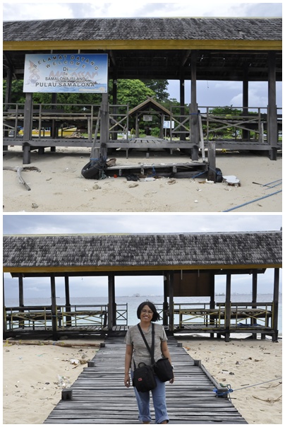 Hampir 15 menit kami duduk-duduk di dermaga ini melihat orang-orang lalu lalang naik turun kapal sambil iseng-iseng tawar menawar dan ngobrol dengan tukang perahu ke Pulau Samalona. Akhirnya disepakati harga Rp. 300.000 pulang pergi dan perjalanan akan memakan waktu sekitar 30 menit. Setelah melewati pulau Lae-Lae, angin bertiup cukup kencang dan mendung mulai merayap di kaki langit. Bapak tukang perahu mulai ngebut berlomba dengan mendung menuju Pulau Samalona. Betul juga ketika merapat di Samalona, hujan deras langsung turun. Kami nekat saja pakai jas hujan jalan-jalan keliling pulau yang luasnya tidak lebih dari 2.34 hektar ini. Pulau ini dulu luasnya 6.7 Ha tapi makin lama makin menyusut dan mungkin seperti Pantai Kuta, dimasa depan pulau ini akan menghilang.