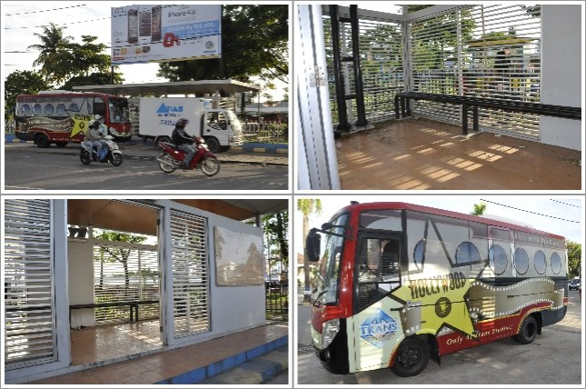 Dari pantai Losari memang tidak ada penunjuk jalan yang jelas menuju halte ini. Di buku Travelicious pun hanya tertulis “terletak di depan rumah jabatan walikota”, di website resmi Trans Studio juga tidak disebutkan masalah halte dan shuttle bus. Sempat bertanya kepada dua orang, satu menyarankan naik taksi yang satu malah tidak tahu dimana rumah walikotanya :). Akhirnya nekat aja jalan terus melewati RSU. Stella Maris sampai akhir Jln. Penghibur. Ketika arah lalu lintas berubah menjadi 2 arah satu berbelok menuju Jln. Metro Tanjung Bunga dan satu lurus kearah Jln. Penghibur kami menemukan satu halte yang kami “curigai” sebagai halte shuttle bus menuju Trans Studio Makassar. Sebenarnya halte itu cukup bagus cuman sayang terlihat kotor dan tidak terurus. Dari luar hanya nampak sebuah billboard raksasa iklan kartu kredit dan di dalamnya juga tidak nampak tanda-tanda ada hubungan dengan TSM. Dari hasil tanya-tanya dengan seorang bapak yang sedang duduk di dalamnya, ternyata benar ini adalah halte bus yang dimaksud.