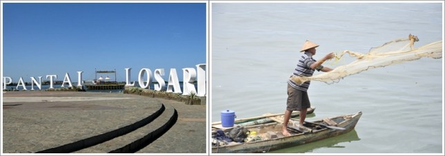 Pantai Losari merupakan salah satu landmark wajib kunjung di Makassar. Disamping gratis, posisinya yang unik yaitu memanjang dari utara ke selatan memungkinkan orang untuk melihat matahari terbit dan tenggelam disatu titik berdiri yang sama. Sebenarnya waktu yang ideal untuk mengunjungi pantai ini adalah sore hari saat matahari akan tenggelam. Udara yang tidak terlalu panas, lalu lalang orang, banyaknya pedagang makanan dan pemandangan sunset yang indah akan menjadi daya tarik tersendiri bagi pantai ini. Setelah 15 menit berpanas-panas menonton orang memancing dan menjala ikan, kami melanjutkan perjalanan mencari halte shuttle bus menuju Trans Studio Makassar.