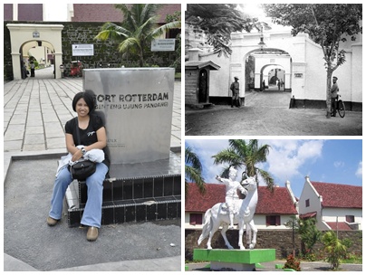 Tujuan pertama saya hari ini adalah benteng paling terkenal di Makassar yaitu Fort Rotterdam. Berjarak 15 menit jalan santai dari hostel (sekitar 600 mt), benteng ini sangat mudah dikenali dari arsitektur gedungnya yang serba kemerahan dan bernuansa ‘Belanda’. Rute jalan kaki dari hostel menuju benteng dimulai dariΒ  Jln. Jampea – Jln. Ahmad Yani – Jln. Riburrane – Jln. Ujung Pandang. Jam buka benteng adalah jam 08.00 – 15.30, tidak ada tiket masuk hanya pada saat mengisi buku tamu diharapkan pengunjung memberi donasi sesukanya.Benteng ini dulunya adalah milik kerajaan Gowa-Tallo, tapi waktu itu konstruksinya terbuat dari batu padas dan tanah liat dan berbentuk seperti seekor penyu yang hendak merangkak turun ke lautan. Dari segi bentuknya sangat jelas filosofi Kerajaan Gowa, bahwa penyu dapat hidup di darat maupun di laut. Begitu pun dengan Kerajaan Gowa yang berjaya di daratan maupun di lautan.