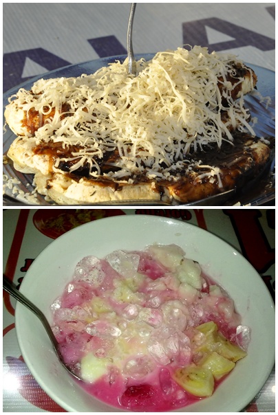 Dari Jln. Penghibur kami jalan kaki kembali ke Pantai Losari. Disamping ingin menikmati pantai di sore hari, kami juga ingin menjelajahi Kawasan Kuliner Makassar yang berada di depan anjungan Pantai Losari tepatnya di Jln. Datu Musseng disamping RSU. Stella Maris. Berhenti di Anjungan Pantai Losari, kami mencoba jajanan Pisang Epe yang banyak dijual di daerah itu. Pisang Epe adalah pisang bakar yang dijepit hingga pipih dan disajikan dengan gula merah dengan beberapa varian rasa seperti coklat, susu dan keju. Harga perporsinya Rp. 12.000 berisi 3 pisang yang cukup besar (sampai tidak habis dimakan berdua). Selain pisang epe, kami juga mencoba Es Palu Butung dengan harga perporsi Rp. 10.000. Es ini adalah es campur gaya Makassar dengan bubur sumsum dan pisang kepok dicampur dalam santan yang diatasnya ditaburi es serut dan susu kental manis seperti layaknya es campur.