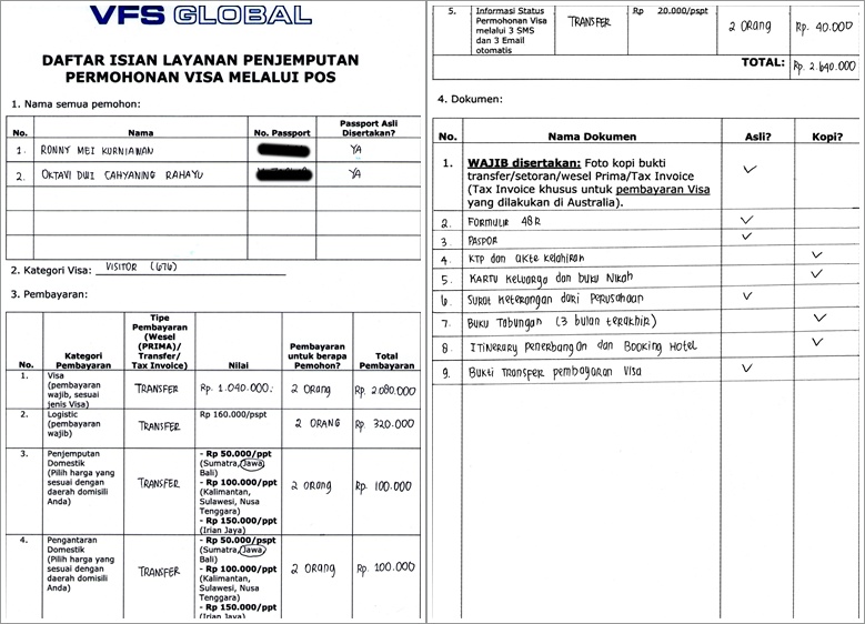 Pertama, setelah berkas visa sudah benar-benar siap. Isi daftar isian atau checklist layanan penjemputan permohonan Visa melalui pos yang bisa di download disini.