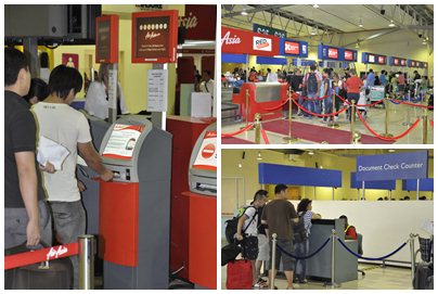 Prosedur check-in bagi penumpang pesawat Air Asia X sedikit berbeda dan lebih ketat baik soal bagasi maupun dokumen. Pertama, kita melaksanakan Self Check-In yang bisa dilakukan melalui internet atau handphone yang berlaku mulai 48 jam sampai 4 jam sebelum jam keberangkatan atau bisa juga melalui Self Check-In Kiosk di Airport yang berlaku mulai 6 sampai 1 jam sebelum keberangkatan. Jadi pastikan 1 jam sebelum keberangkatan anda sudah melakukan check-in karena proses ini ditutup 1 jam sebelum berangkat. Setelah Check-In, prosedur kedua adalah drop bagasi bagi yang memiliki bagasi. Proses ini dapat dilakukan di konter Baggage Drop sambil membawa paspor dan bukti check-in. Sebaiknya jatah bagasi dibeli melalu internet karena jatuhnya akan lebih mahal bila beli di konter. Bila tidak punya bagasi seperti saya bisa langsung menuju Document Check Counter. Disini sekali lagi dokumen-dokumen kita akan diperiksa mulai dari paspor, visa dan boarding pass. Setelah selesai penumpang bisa langsung menuju Departure Gate. Dari Departure Gate ini masih akan ada 6 pemeriksaan lagi seputar paspor, visa dan boarding pass sebelum penumpang dapat duduk dengan enak di pesawat.