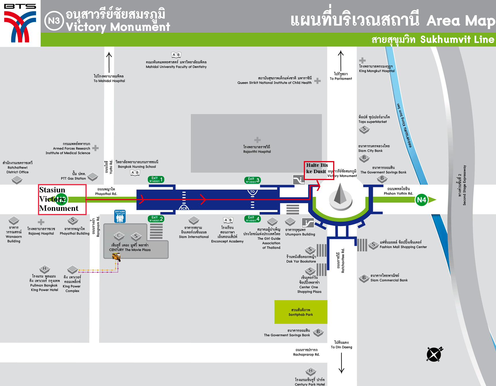 Peta berikut adalah peta jalan kaki dari stasiun Victory Monument ke tempat pangkalan bis menuju Dusit Park (ikuti garis merah). Hati-hati di tempat ini jalurnya agak membingungkan karena banyak sekali exit dan perempatan dengan penunjuk jalan yang hampir tidak ada. Intinya ambil saja arah kiri dan turun di tangga sebelah kiri dari Monument Victory. Bila ingin bertanya ke orang-orang sekitar sebutkan saja bis mana yang ke Dusit Zoo karena disitu Dusit Zoo sepertinya lebih terkenal daripada Istana Vimanmek.