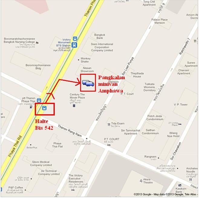 Saat naik bis dari depan istana Vimanmek sempat ragu juga dengan nomor bisnya, untunglah di halte kami bertemu dengan sesama penumpang yang baik hati. Walaupun sama sekali tidak bisa berbahasa Inggris, si bapak membantu memilihkan bis yang tepat (kebetulan dia juga mau naik bis yang sama) dan saat didalam bis dia minta peta kami dan aktif bertanya-tanya ke kondektur dalam bahasa Thai. Mungkin dia kurang yakin juga karena Century Movie Plaza seperti nama-nama alamat dalam bahasa Inggris pasti punya sebutan lain dalam bahasa Thailand yang sangat berbeda pengucapannya. Ketika sudah yakin kalau kami berada di bis yang benar, si bapak menitipkan kami ke kondektur supaya diturunkan di tempat yang dituju karena dia akan turun duluan. Terima kasih ya pak, semoga Allah melimpahkan rejeki dan kesehatan buat bapak :). Peta jalan kaki dari halte Victory Monument ke pangkalan minivan Amphawa dapat dilihat pada gambar berikut ini.