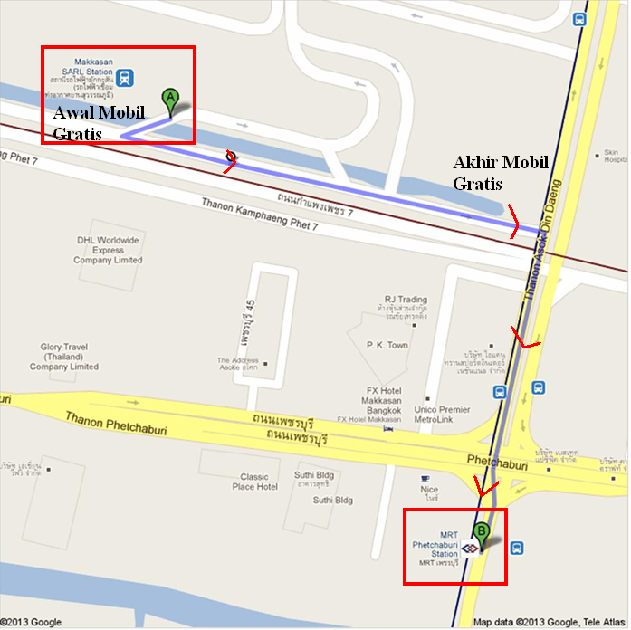 Peta Jalan Kaki Dari Stasiun Makassan ke Stasiun Phetchaburi (Sumber : Google Map dengan modifikasi sendiri)
