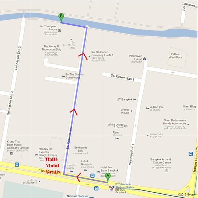 Keluar di stasiun National Stadium, ambil saja exit 2 dan jalan kaki kurang lebih 450 meter menuju Jim Thompson House mengikuti arah peta dibawah ini. Jangan kuatir tersesat karena petunjuk jalannya jelas sekali. Sekali lagi bila ragu, tanya saja pada warga sekitar mereka pasti tahu dan menunjukkan arahnya. Saking ngetopnya sampai-sampai surat yang hanya bertuliskan alamat “Jim Thompson, Bangkok” saja bisa sampai dengan tepat ke rumahnya. Bila tidak ingin jalan kaki, di mulut jalan Soi Kasemsan 2 ada mobil golf gratis yang mengangkut pengunjung dari jalan besar menuju Jim Thompson House. Mobil golf ini jumlahnya terbatas, jadi saat sampai di mulut jalan mobilnya tidak ada, tunggu saja sebentar.