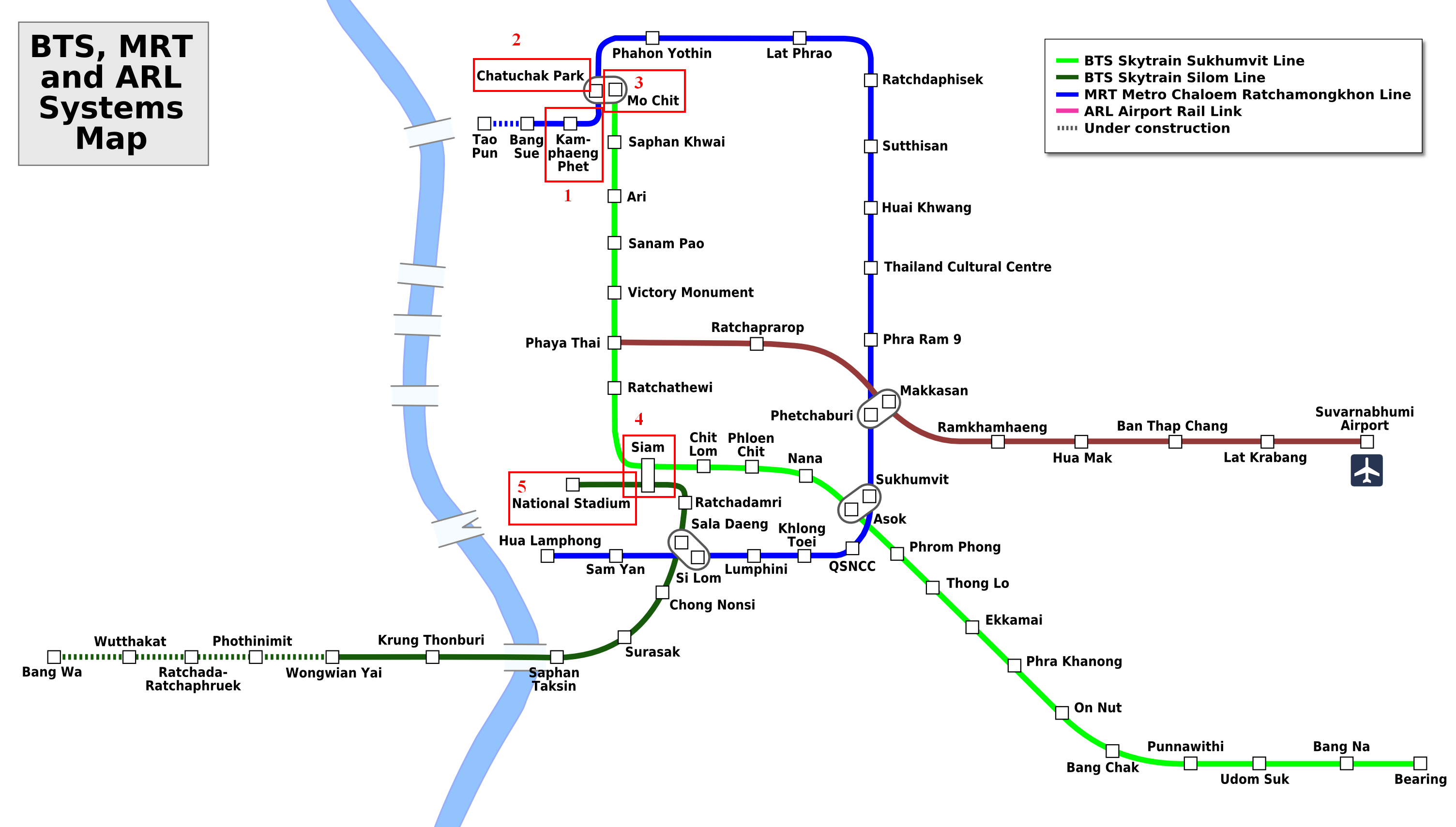 Peta jalur kereta dari hotel menuju Chatuchak dapat dilihat pada gambar berikut (seperti biasa stasiun pemberhentian ditandai dengan kotak merah dan diberi nomor):