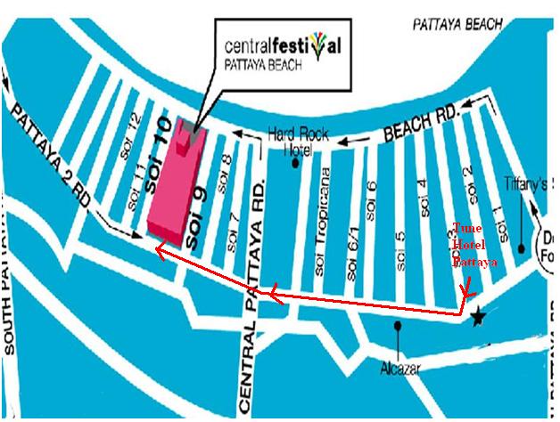Central Festival Pattaya Beach Mall ini buka dari jam 11 pagi sampai 11 malam. Lokasinya kira-kira berada di Soi 9 antara Pattaya Beach Road dan Second Road. Peta jalan kaki dari Tune Hotel Pattaya ke Central Festival dapat dilihat pada peta dibawah ini. Selesai makan, kami naik baht bus kembali ke hotel berbarengan dengan orang-orang yang akan clubbing di bar atau jalan-jalan di area Walking Street. Yah, buat Pattaya, jam 9 malam serasa masih sore dan malam masih panjang. Tapi buat emak-emak seperti saya jam 9 sudah waktunya untuk tidur manis di hotel :).