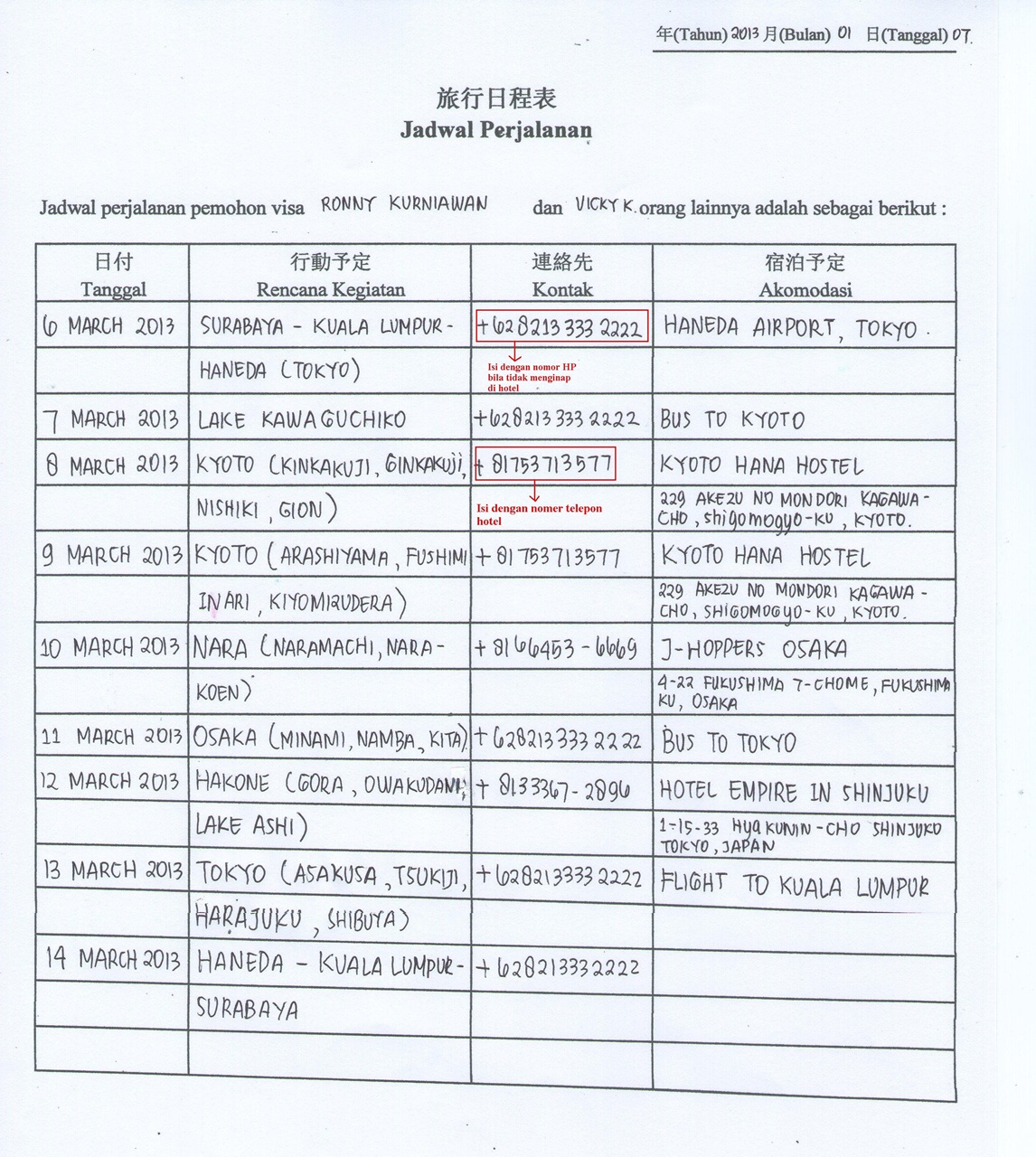 5. Jadwal Perjalanan yang mencantumkan semua kegiatan sejak masuk hingga keluar Jepang. Jadwal perjalanannya bisa didownload disini, Saat itu detail itinerary yang saya buat menggunakan format dari link diatas salah sehingga pihak Konjen memberikan format baru yang saya isi seperti contoh dibawah ini. Jadwal perjalanan yang saya buat pertama kali salah karena kurang detail. Ada 3 kesalahan yang saya buat, Pertama, saat itu saya tidak mencantumkan nomor telepon dan alamat hotel tempat menginap (karena di format pertama tidak ada kolom nomor telepon). Kedua, saya hanya mencantumkan kegiatan saya di Jepang. Pihak Konjen meminta semua kegiatan dicantumkan mulai dari Indonesia sampai ke Indonesia kembali (sesuai destinasi tiket). Ketiga, kurang detail menulis tempat-tempat yang akan saya kunjungi. Jadi misalnya akan berkunjung ke Nara, tidak boleh hanya dituliskan Nara saja tapi harus dicantumkan tempat-tempat mana saja di Nara yang akan dikunjungi. Contoh penulisan Jadwal Perjalanan yang benar bisa dilihat pada gambar dibawah ini.