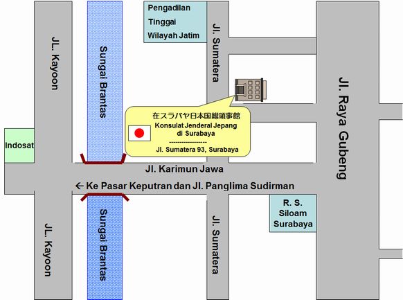 Karena saya berdomisili di Malang, maka visa Jepang ini saya ajukan sendiri melalui Konsulat Jendral Jepang di Surabaya yang berkantor di Jl. Sumatera No. 93, Surabaya, Telephone : (031) 503-0008 dan Fax : (031) 503-0037, 502-3007 (Visa). Website resminya http://www.surabaya.id.emb-japan.go.jp/ yang memiliki wilayah yurisdiksi (wilayah kerja) : Jawa Timur, Kalimantan Timur, Kalimantan Selatan. Untuk urusan visa alamat e-mail yang bisa diakses adalah visa@sb.mofa.go.jp . Jam kerjanya hari Senin-Jumat (Kecuali pada hari libur nasional dan libur Konjen yang jadwalnya bisa di cek di alamat website diatas) dengan waktu pengajuan visa jam 08:15 -11:30 dan waktu pengambilan 13:15 -15:30. Jadi sebelum mengajukan visa jangan lupa dicek dulu hari libur nasional dan hari libur konjen. Peta jalan kantor Konjen Jepang dapat dilihat pada gambar berikut ini :