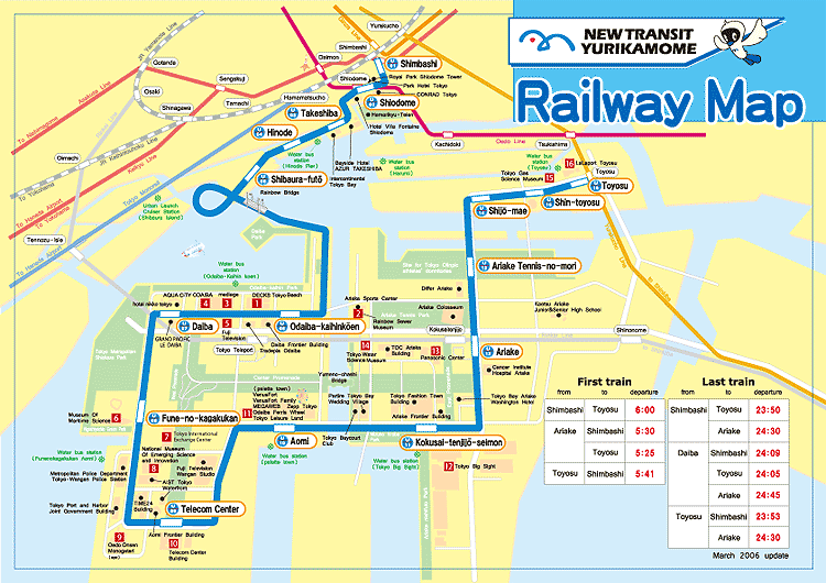 Salah satu cara menuju Odaiba Island adalah dengan naik kereta khusus Yurikamome Line yang menghubungkan Shimbashi Station dengan Toyosu station dan melewati semua atraksi di Odaiba. Perjalanan antara Shimbashi dan Daiba Station memakan waktu kurang lebih 15 menit. Harga tiketnya lumayan mahal yaitu 310 yen sekali jalan yang harus dibeli tersendiri karena tidak termasuk dalam JR Pass serta Metro dan Subway Pass. Kalau naik Yurikamome lebih dari dua kali dapat dipertimbangkan untuk membeli one day pass seharga 800 yen yang jatuhnya akan lebih murah daripada harga reguler. Yurikamome sendiri menggunakan kereta khusus yang mirip sekali dengan monorail (relnya diatas) tapi tidak ada supirnya. Jadi semuanya bersifat otomatis karena dikendalikan dengan komputer. Rute kereta Yurikamome Line dapat dilihat pada gambar dibawah ini, sedangkan website resminya dapat diklik disini.