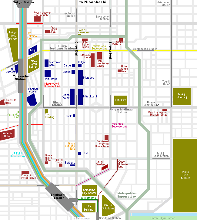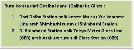 Ginza sesuai dengan namanya, dulu merupakan sebuah rawa-rawa yang disulap menjadi tempat pembuatan koin perak (Silver Mint). Setelah terjadi kebakaran hebat yang memusnahkan hampir semua bangunan, pemerintahan Meiji membangun kembali area tersebut dengan menjadikannya contoh dari modernisasi. Tidak tanggung-tanggung mereka sampai mendatangkan seorang arsitek dari Inggris untuk mendesain area itu. Jadi saat itu, Ginza merupakan satu-satunya area di Tokyo yang bernuansa barat dengan gedung batu bata dan jalan-jalan yang lebar. Sayangnya banyak bangunan-bangunan dari bata itu yang kurang laku dijual karena walaupun indah untuk dipandang tapi harganya mahal dan tidak sesuai dengan iklim serta gaya hidup orang Jepang. Tapi hal itu berbanding terbalik dengan keadaan sekarang. Ginza yang sekarang, sudah berkembang menjadi salah satu pusat perbelanjaan dan hiburan paling terkenal di Tokyo. Konsumen yang dituju terutama adalah kalangan menengah keatas. Kalau dulu kurang laku untuk dijual sekarang menjadi salah satu kawasan real estate paling mahal di Jepang dimana satu meter persegi tanah bernilai lebih dari 10 juta yen. Untuk menuju tempat ini, berikut saya tuliskan rute kereta dari Odaiba Island menuju Ginza.