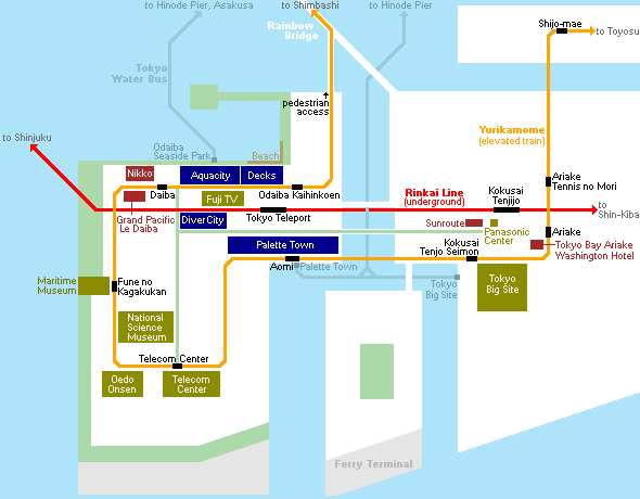 Tidak terasa hampir 2 jam kami menghabiskan waktu ditempat ini. Maunya makan siang di DiverCity tapi setelah melihat-lihat kok tidak ada menu makan siang yang dirasa halal dan pas dihati. Jadi dari DiverCity kami berjalan kembali ke Daiba Station dan naik kereta Yurikamome menuju Ginza. Peta Odaiba Island dapat dilihat pada gambar berikut ini.