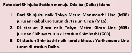 Odaiba Island sebenarnya adalah sebuah pulau kecil buatan manusia yang terletak di Tokyo Bay. Di jaman Edo, pulau ini sengaja dibangun sebagai benteng pertahanan dari serangan laut dan setelah seabad kemudian fungsinya beralih menjadi pusat belanja dan entertainment. Dari Shinjuku Station tempat ini dapat dicapai dengan kereta. Rutenya sebagai berikut :