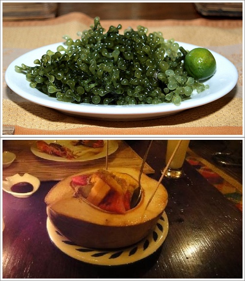 Ketika sudah dipersilahkan masuk, kita diminta untuk melepas sepatu atau sandal dan menyimpannya di loker kayu. Baru kali ini saya masuk restoran tanpa sepatu, tapi saya tidak keberatan karena lantainya bersih dan semuanya terbuat dari kayu. Ketika disodori menu, saya akui harga-harganya memang diatas budget kita, tapi bolehlah sekali-kali memanjakan diri sendiri. Akhirnya dari hasil diskusi yang panjang, kita sepakat memesan menu “Kalui Special Of The Day” yang terdiri dari Fish Steak, Udang, Veggies of the Day, Chili Crabs, nasi dan makanan pembuka. Menu ini disajikan sebagai paket makan berdua seharga 395 PHP. Untuk minumnya kami pesan dua Bukoconut (es kelapa muda). Total makan disini plus biaya service sekitar 556 PHP.
