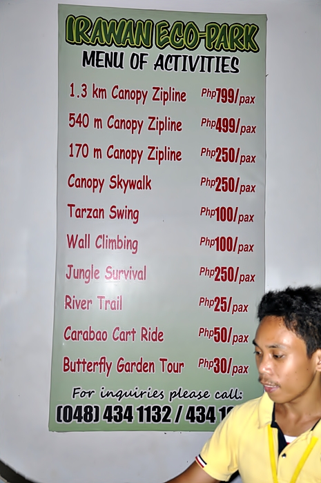 Biaya tur ke Irawan Eco Park ini 1300 PHP perorang sudah termasuk antar jemput dari hotel, makan siang, 1.3 km zipline ride, Skywalk Adventure, River Trail and Fish Feeding, Carabao Cart Ride, kunjungan ke Butterfly Park dan Hagedorn Eco Home Tour. Biaya turnya dibayar langsung saat tiba di sana. Bila dihitung satu persatu biaya dari tiap kegiatan, ikut tur jatuhnya akan lebih murah.