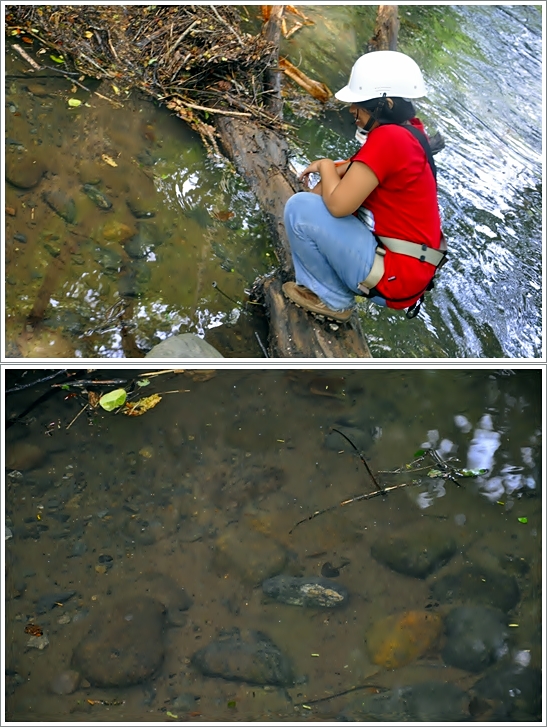 Turun dari Skywalk Adventure, mbak guide memberi saya biskuit. Saya yang tidak ‘ngeh’ biskuit ini untuk apa, langsung aja main makan dan telan. Yah, kegiatan alam liar membuat saya kelaparan. Setelah memberikan biskuit, dia menyuruh saya melemparkannya ke atas sungai. Hah ! padahal biskuitnya sudah habis saya telan. Saya yang bingung kenapa kok biskuitnya harus dibuang ke sungai, mendapat penjelasan dari mbak-nya kalau kegiatan kita selanjutnya adalah memberi makan ikan. Ha ha ha rupanya biskuit itu untuk makan ikan toh. Yah, dengan sangat menyesal akhirnya si mbak harus bersusah payah mengambil biskuit lagi di resepsionis.
