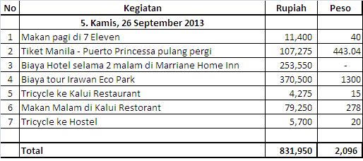 Saat itu hanya ada kita berdua, jadi suasananya enak karena tidak terlalu ramai. Makan berdua di cafe dengan pemandangan hutan yang menghijau. Ditambah suasana sepi dan suara burung berkicau yang menemani saat makan bikin hati adem dan mengantuk πŸ™‚ . Akhirnya tepat jam 4 sore, kami memutuskan menyudahi makan siang yang sangat terlambat ini dan naik tricyle untuk kembali ke hotel. Secara keseluruhan, kegiatan di Irawan Eco Park ini tidak semuanya menarik. Yang paling seru hanyalah kegiatan zipline-nya saja yang tidak cocok untuk orang tua dan anak-anak. Jadi bila ingin berzipline dengan dana terbatas lakukan sendiri zipline tanpa ikut tur. Caranya : pertama, naik multicab bertanda Irawan atau Iwahig yang biasanya melintas di sepanjang Rizal Avenue (tarif 20 PHP) dan jalan kurang lebih 10 menit masuk ke dalam Irawan Eco Park. Kedua, sesampai di Irawan pilih kegiatan zipline saja. Untuk rute sejauh 1.3 km biayanya 799 PHP, rute 540 mt 499 PHP dan rute terpendek 170 mt biayanya 250 PHP. Bila kita ambil rute terpanjang biaya keseluruhan berzipline tanpa ikut tur kurang lebih 839 PHP sudah termasuk biaya tricycle pulang pergi. Kunjungan ke Irawan Eco Park ini membuka mata saya betapa hal-hal yang sederhana ternyata bisa dijual sebagai obyek wisata. Nah, kalau sudah begitu saya jadi sangat menyayangkan bila mengingat betapa hutan di Indonesia yang jauh lebih indah dan menawan tidak dimanfaatkan secara maksimal seperti disini.