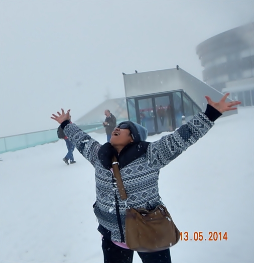 Ekspresi bahagia ibu saat melihat salju. Bila melihat kebahagiannya, terbayar sudah jerih payah kami membawanya ke Eropa)