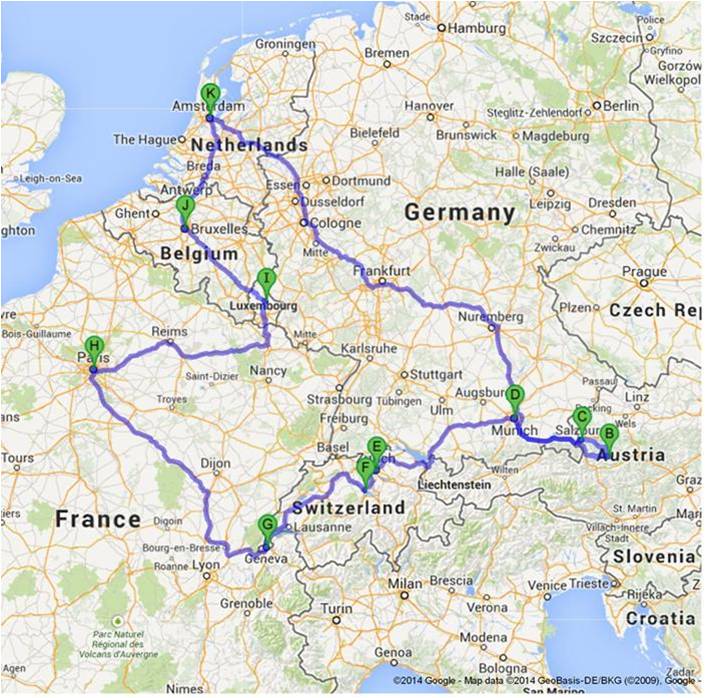 Setelah ada kepastian tiket pesawat, mulailah saya menyusun itinerary untuk perjalanan selama 19 hari. Dengan tiket pesawat pulang pergi dari Amsterdam, maka saya pilih jalur melingkar yang berawal dan berakhir di Amsterdam. Mulanya mau menjelajah sampai Berlin dan Praha, tapi setelah dihitung-hitung waktunya tidak akan cukup. Selain itu saya juga harus realistis mengingat dalam perjalanan kali ini saya membawa ibu yang sudah berumur. Jadi akhirnya setelah coret sana sini diputuskan bahwa rute melingkarnya akan dimulai dari Amsterdam – Hallstaat – Salzburg – Munich (Fussen) – Zurich – Lucerne – Interlaken – Jenewa – Paris – Luxembourg – Brussel – Amsterdam.