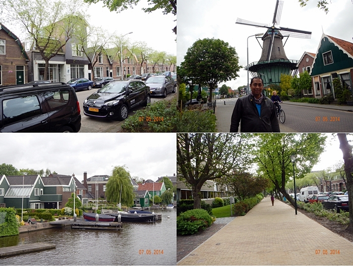 Saat merencanakan rute ini sebenarnya saya ragu karena masih harus jalan sekitar 1 km untuk sampai ke tujuan. Sempat terpikir untuk naik bis tapi sayang dengan tiket Eurail Passnya. Saya khawatir dengan kondisi ibu, takutnya tidak kuat jalan. Tapi Alhamdulillah setelah turun di stasiun Koog – Zaandijk ternyata cuaca sangat bersahabat, sejuk dan tidak panas. Selain itu karena ini adalah kota kecil, lalu lintas sangat sepi dengan jalur pejalan kaki yang luas dan teduh sehinggan enak untuk jalan. Nampaknya pagi itu hanya kita bertiga yang keluyuran di jalan, serasa menjelajah kota mati saja. Terbiasa dengan kondisi kota-kota di Indonesia yang padat, saat menjelajah kota-kota atau desa-desa kecil di Eropa seringkali saya heran melihat suasananya yang sepi. Tidak ada orang yang keluyuran di jalan,ngobrol dengan tetangga, menyiram bunga atau anak-anak main sepeda. Saya tidak tahu apakah mereka bekerja atau sedang beraktivitas di dalam rumah pokoknya jalanan kebanyakan sepi sehingga mau ngobrol dengan suara keras pun jadi sungkan karena terdengar ribut sekali.