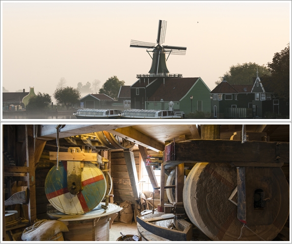 Selain rumah kuno, ada 4 kincir angin yang juga dipindahkan dan dibangun ulang disini. Kita dapat masuk dan melihat proses produksi dalam kincir-kincir angin ini dengan membayar E 4 perkincir. Kalau memang niat ingin berkunjung ke salah satu kincir dan museum-museum disini bisa membeli Zaansche Schans Card seharga E 11.5. Dengan kartu ini kita bebas bekunjung ke  Zaans Museum/Verkade Pavilion, the Coopery dan memilih satu dari 3 industrial windmills. Saya sendiri tidak membeli kartu ini, hanya jalan-jalan dan masuk ke beberapa museum dan kincir angin yang gratis.