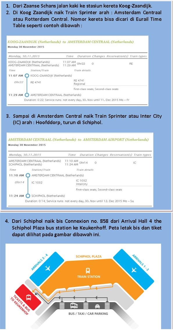 Dari Zaanse Schans, kami melanjutkan perjalanan ke taman bunga terbesar di dunia, Keukenhoff. Untuk itu kami harus kembali ke Amsterdam Centraal dilanjutkan naik kereta ke Schiphol dan naik bis ke Keukenhoff. Rute kereta dan bis dapat dilihat pada gambar di bawah ini :