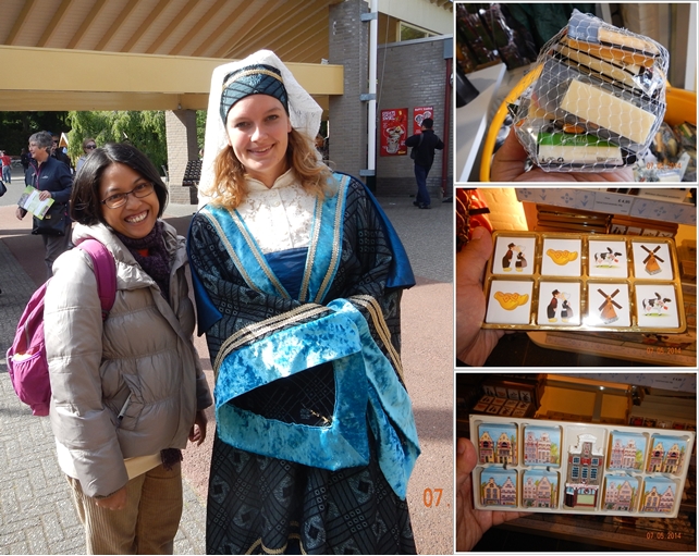 Tanpa terasa 4 jam kami habiskan di taman ini. Sebelum pulang menyempatkan diri berfoto bersama seorang gadis berpakaian tradisional Belanda yang bertugas sebagai penyambut (Greeter) sekaligus membagikan brosur tentang Keukenhoff. Sambil menunggu bis, kami mampir sebentar di toko souvenir dekat gerbang Keukenhoff. Niat awal hanya untuk lihat-lihat saja karena harganya kurang cocok di kantong 🙂 . Tapi akhirnya beli juga satu kantong kecil keju yang berisi berbagai jenis keju batangan  yang menurut saya cocok untuk dimakan sendiri atau dijadikan oleh-oleh.