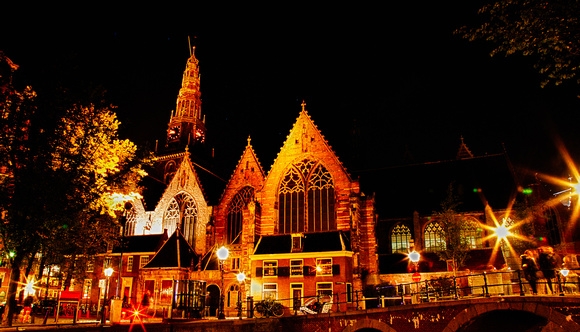 Dari Condomerie, kami berjalan menyusuri Trompettersteeg, sebuah gang kecil dengan jendela merah di kiri kanannya. Dengan lebar gang kurang lebih 1 meter, saya sama sekali tidak berani menengok ada apa di balik jendela karena kentara banget kalau hanya melihat-lihat saja. Tapi sepintas memang terlihat banyak cewek seksinya, serasa lewat di gang toko mainan dengan kotak-kotak Barbie di kanan kiri. Mengikuti gang kecil ini sampailah kami pada tempat yang mungkin jarang ada di kawasan lokalisasi yaitu Oude Kerk, gereja tertua di Amsterdam. Secara moral memang terlihat kontradiktif karena letaknya yang hanya selemparan batu dari kawasan prostitusi. Gereja dengan bangunan bergaya gothik ini dibangun diatas kuburan sehingga di lantainya banyak terdapat batu-batu makam. Beberapa warga terkemuka Amsterdam juga dikuburkan disini. Seakan menambah kontradiksi didepannya terdapat patung Belle dan disebelah kirinya ada Nursery School. Mungkin hanya disinilah kita bisa menjumpai gereja dan sekolah TK berada jadi satu di kawasan lokalisasi.
