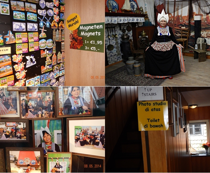 Mungkin bagi turis Indonesia tidak ada tempat paling top di Belanda selain Volendam. Daerah yang dulunya adalah desa nelayan kecil ini sekarang berkembang menjadi pusat turisme yang luar biasa. Hampir semua travel agen di Indonesia menawarkan perjalanan ke Volendam dalam paket tour nya. Apa sih yang dikerjakan turis Indonesia di Volendam? kebanyakan datang kesini untuk berfoto dengan baju tradisional Belanda karena banyak studio foto disekitar Haven yang menawarkan paket ini dan bila diteliti harganya pun sama. Menariknya lagi banyak studio foto yang menjadikan artis atau tokoh-tokoh politik di Indonesia sebagai modelnya. Mulai dari Rano Karno, Maya Rumantir, Debby Sahertian sampai Gus Dur semuanya ada disini. Belum lagi petunjuk-petunjuk dalam bahasa Indonesia yang banyak bertebaran disekitar tempat ini menjadikan Volendam berasa Indonesia. Saya pribadi kurang tertarik dengan Volendam apalagi berfoto menggunakan baju tradisional seperti yang dilakukan kebanyakan orang. Tapi ibu tampaknya sangat tertarik dan ingin mencoba, jadilah kami mengantarkan beliau ke salah satu studio foto yang menyediakan fasilitas ini. Waktu itu kami pilih studio foto De Boer yang paling banyak direkomendasikan di Trip Advisor. Harga termurah adalah E 15 untuk 2 foto ukuran 13×18 cm dan 20×30 cm.