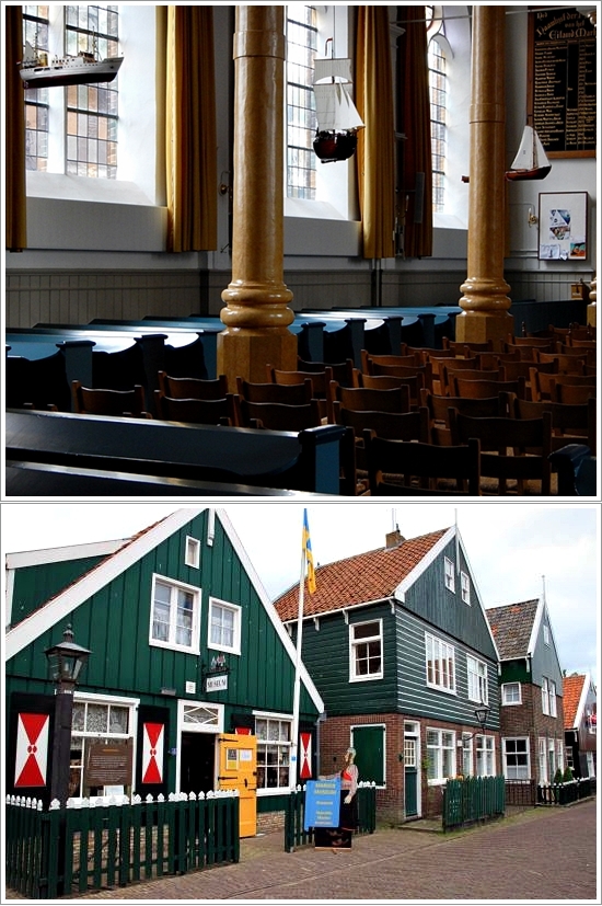 Dari museum Kijkhuisje Sijtje Boes, kami menjelajah Marken sampai Grote Kerk, sebuah gereja Protestan yang dibangun pada abad ke 19. Interiornya lain daripada yang lain karena banyak model-model kapal kayu yang digantung di langit-langitnya. Dari Grote Kerk, saya menjelajah sebentar ke Marker Museum. Berbeda dengan museum Kijkhuisje Sijtje Boes yang gratis, Marker Museum ini berbayar dengan harga tiket E 2.5 per orang. Museum ini tidak buka sepanjang tahun dan hanya buka dari bulan April sampai November. Karena berbayar tentu saja koleksinya jauh lebih lengkap dan mendalam daripada Kijkhuisje Sijtje Boes. Bangunan luarnya sudah mencerminkan rumah khas Marken dengan bagian dinding dan perapian dihiasi banyak piring cetak dari Delft, baju-baju dan peralatan yang disimpan dalam kotak-kotak bercat warna-warni, perapian terbuka, tangki tadah air hujan dan tempat tidur serta lemari yang dicat.