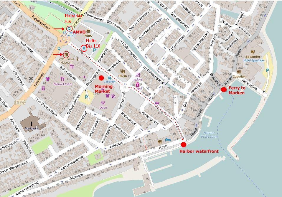Setelah puas menjelajahi Edam, kami berjalan kembali ke Edam Bus Station untuk melanjutkan perjalanan ke Volendam. Dari Edam, kita bisa naik bis no. 110 jurusan Amsterdam Noord atau bis no 316 jurusan Amsterdam CS turun di bus stop Vissersstraat yang terletak di jalan Julianaweg. Dari pemberhentian bis ini tinggal jalan kaki ke pusat keramaian Volendam yang berada di sepanjang Noordeinde, Haven dan Zuideinde. Peta jalan kaki dari Vissersstraat Bus Stop sampai Volendam bisa dilihat pada peta dibawah ini.