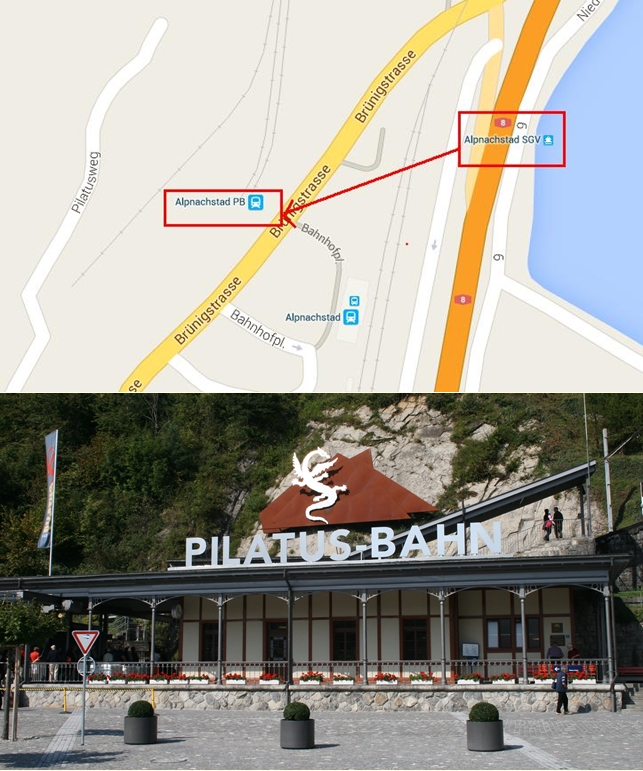 Sampai di pelabuhan boat di Alpnachstad, kami berjalan kaki menuju stasiun kereta Pilatus Bahn untuk naik Pilatus Cogwheel. Pada dasarnya sangat mudah menemukan stasiun kereta ini karena kebanyakan penumpang boat yang turun di Alpnachstad pasti bertujuan ke Pilatus Bahn. Keluar dari pelabuhan berjalan saja ke arah kiri, disitu ada tangga turun menyeberang melalui terowongan bawah tanah dengan stasiun kereta Pilatus Bahn berada di ujungnya. Sebelum naik kereta jangan lupa menukarkan tiket yang kita beli dengan tiket kereta. Peta jalan kaki dari pelabuhan boat menuju stasiun kereta dapat dilihat pada gambar dibawah ini.