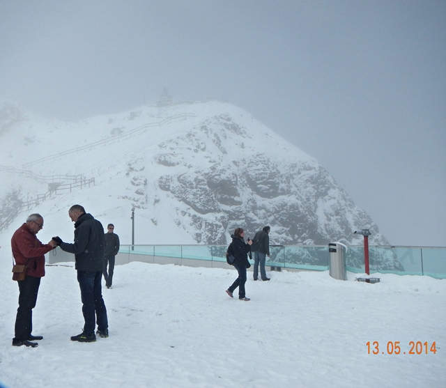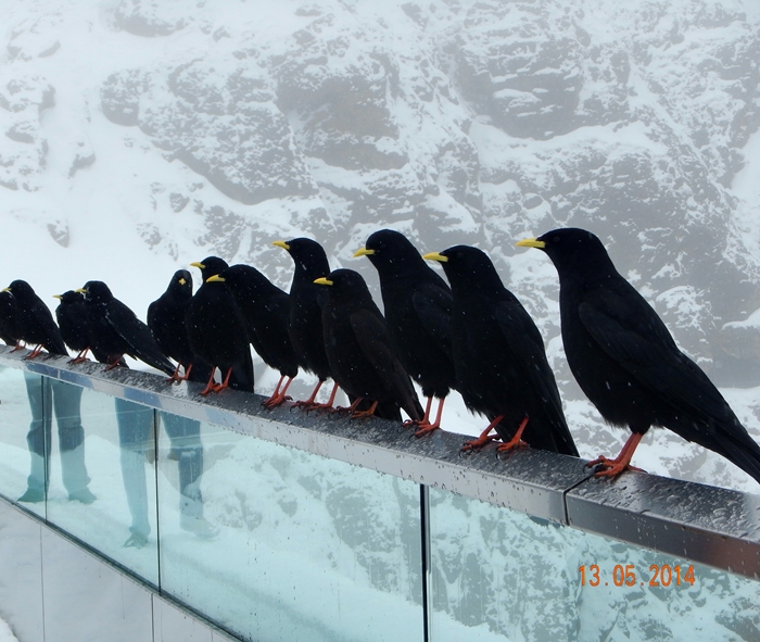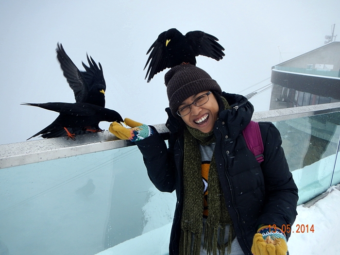 Di puncak ini kita juga banyak menjumpai burung Alpine Chough, sejenis burung gagak dengan paruh berwarna kuning. Burung ini memang terkenal hidup di daerah pegunungan karena kemampuan adaptasinya terhadap udara beroksigen tipis. Jadi tidak heran walaupun namanya Alpine Chough burung ini juga banyak dijumpai di jajaran pegunungan Nepal, Afrika Utara dan Asia Tengah. Kebetulan saat itu ibu membawa roti tawar dalam tasnya, jadilah kita bermain-main sambil memberi makan mereka. Begitu tahu kalau kami membawa makanan, burung-burung disekitar tempat itu semua langsung mendekat. Seru juga memberi mereka makan, karena burung-burung ini sangat jinak dan bertengger seenaknya di kepala, tangan dan bahu bila kita diam. Akhirnya banyak pengunjung lain yang memotret kita dengan burung-burung itu. Untuk menambah keasyikan kita bagi-bagikan juga roti yang dibawa kepada pengunjung lain supaya mereka bisa ikutan memberi makan burung-burung itu.