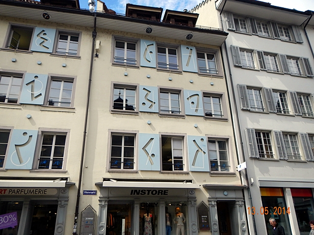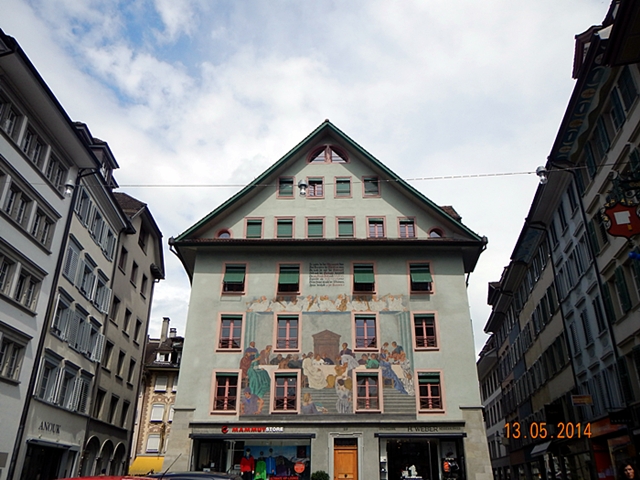 Dari Kornmarkt, kami berjalan menuju Hirschenplatz dan Weinmarkt. Keduanya adalah alun-alun dengan beberapa bangunan berlukis cantik di depannya. Memang salah satu hal yang paling saya ingat di Lucerne adalah bangunan-bangunan kunonya yang dihiasi dengan lukisan dan mural-mural yang indah. Lukisan-lukisan tersebut bisa berupa cerita atau dekorasi seperti bunga dan tulisan-tulisan berhias. Beberapa bahkan menceritakan sejarah dari tempat disekitarnya. Weinmarkt sendiri dulunya adalah Wine Market dan merupakan alun-alun utama kota Lucerne. Bahkan disinilah Town Hall pertama dibangun sebelum dipindahkan ke Kornmarkt.