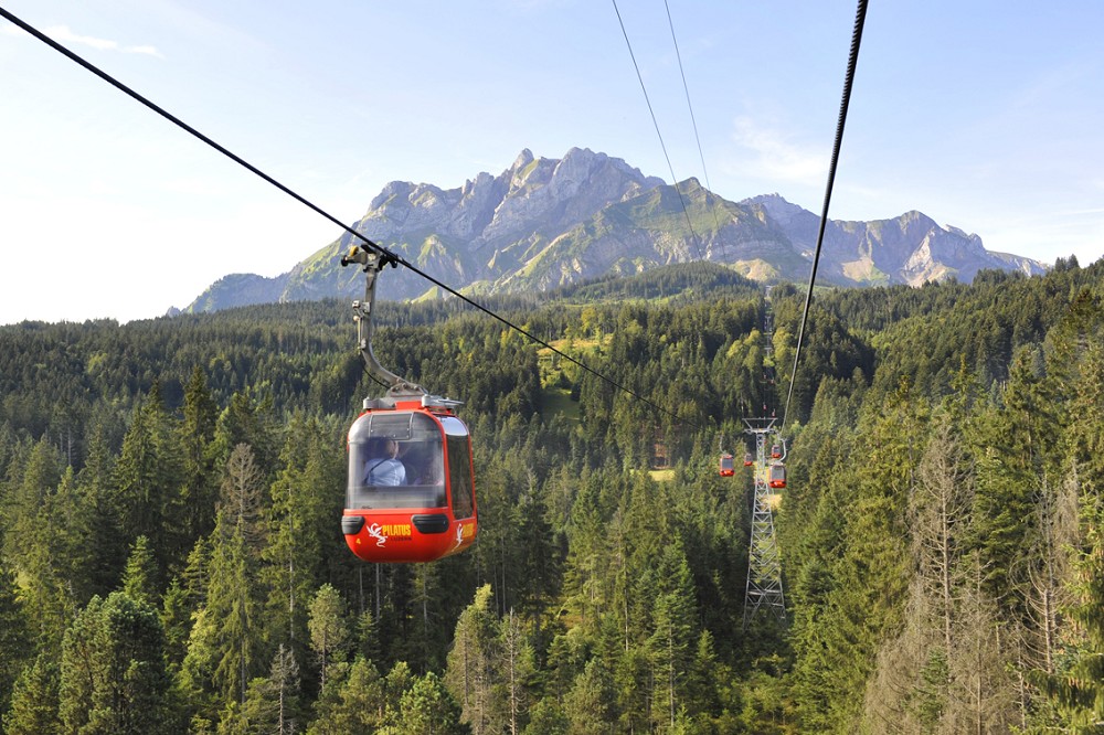 Puas main salju, kami turun dari puncak Pilatus menggunakan  aerial cableway menuju Frakmuntegg. Beda dengan Aerial Cableway baru yang disebut Dragon Ride, cableway yang saya naiki tahun 2014 ini jarak tempuhnya lebih lama dan bentuknya sama seperti cable car dengan bodi yang lebih lebar. Walaupun demikian pemandangan saat turun sama indahnya seperti saat naik. Yang menarik disini adalah warna hutan saat sebagian areanya tertutup salju dan sebagian lagi masih berwarna hijau tanpa salju. Rasanya seperti melihat pohon yang ditaburi gula putih, indah seperti gambar-gambar di kartu pos saat natal.
