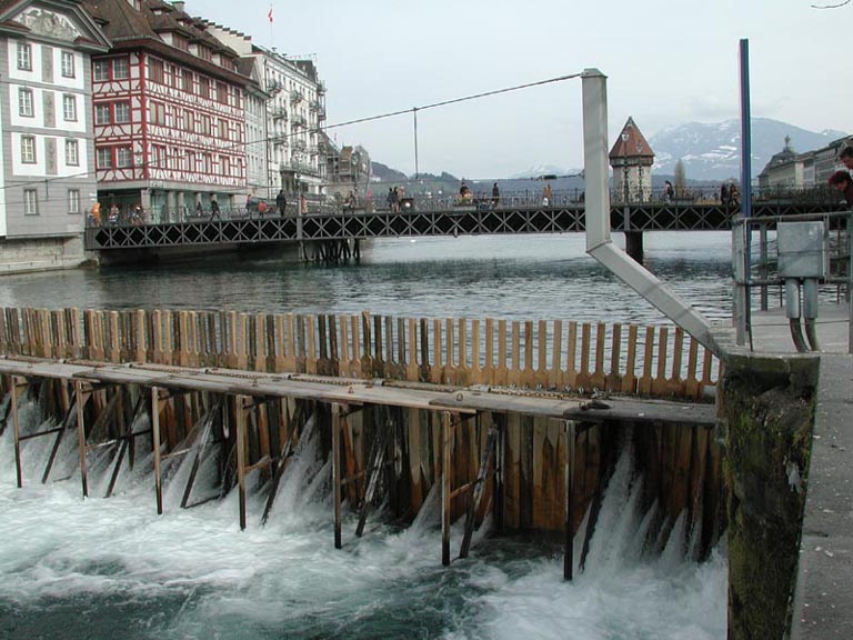 Spreuer Bridge ini dulunya dibangun untuk menghubungkan pabrik penggilingan gandum dengan area tukang roti yang tinggal di bagian kiri sungai. Sementara kebanyakan penduduk Lucerne tinggal di area kanan, para tukang roti itu harus tinggal disebelah kiri karena ketakutan akan kebakaran akibat api yang harus selalu hidup di tungku mereka. Selain lukisan, satu hal lagi yang istimewa di Spreuer Bridge ini adalah Nadelwehr-nya. Disebelah jembatan ini terdapat paku-paku kayu atau Nadelwehr yang bisa dipindahkan untuk mengatur ketinggian air sekaligus mengatur aliran air yang menuju pembangkit listrik.  Paku-paku kayu ini merupakan bagian dari sistim pengairan pada abad ke 16 yang masih digunakan terus sampai sekarang.