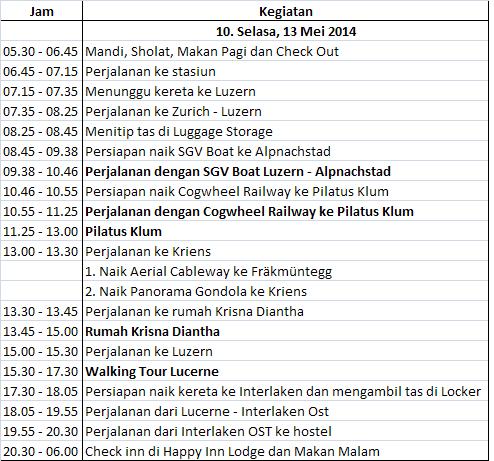 Setelah makan pagi, check out dan menaruh kunci di Drop Box (karena resepsionis belum buka) kami pun berjalan kaki ke Zurich HB untuk mengejar kereta api ke Lucerne.  Perjalanan dari Zurich ke Lucerne memakan waktu kurang lebih 56 menit. Pilihan keretanya sangat beragam dan kebanyakan langsung menuju Lucerne tanpa berganti kereta. Contoh jadwal kereta dari Zurich HB (kalau di Eurail Timetable tertulis Zuerich HB) ke Lucerne (di Eurail Timetable tertulis Luzern Switzerland) dapat dilihat pada gambar dibawah ini.