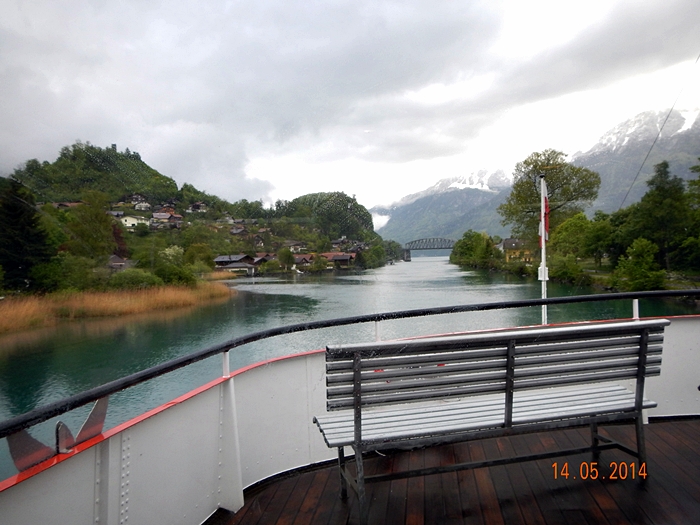 Pada saat naik kita tinggal menunjukkan Eurail Pass dan secara otomatis petugas akan mengarahkan kita ke ruang kelas 1 yang terletak di upper deck. Perjalanan menyusuri danau Brienz memakan waktu kurang lebih 75 menit. Seperti di danau Lucerne, boat juga akan berhenti beberapa kali untuk menaik turunkan penumpang. Dalam perjalanan selama 75 menit ini kami lebih banyak berada dalam ruangan karena diluar dingin, hujan dan berkabut. Sekali-kali saya dan suami keluar bila cuaca memungkinkan. Berbeda dengan pangkalan boat di Lake Lucerne yang langsung berada di pinggir danau, pangkalan boat Interlaken Ost Bsr terletak di sungai Aare sehingga kapal harus menyusuri sungai itu sebelum sampai ke danau.