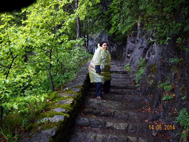 Sesampai di pemberhentian Beatushöhlen-Sundlauenen kami turun dari kapal dan mulai trekking menuju gua. Jarak dari pangkalan boat menuju gua kurang lebih 1 km dan memakan waktu kurang lebih 30 menit jalan kaki. Jalur trekkingnya mendaki melewati hutan-hutan dan merupakan sebagian kecil dari jalur yang disebut Old Pilgrim’s Route. Di beberapa tempat jalur trekkingnya berupa tangga-tangga dari batu. Pada setengah kilo pertama saya sudah kehabisan nafas karena mendaki. Jadi sedikit-sedikit jalan dan sedikit-sedikit istirahat sambil berpikir untung ibu tidak ikut. Lagi enak-enaknya beristirahat sambil mengatur nafas, tiba-tiba saya didahului oleh serombongan murid TK yang rupanya juga akan berdarmawisata ke gua. Sialnya anak-anak kecil itu tenang-tenang aja jalan mendaki bahkan sambil bercerita dan menyanyi-nyanyi. Doh, benar-benar berbanding terbalik dengan saya. Jangankan menyanyi untuk bicara saja nafas rasanya sudah hampir putus 🙂 .